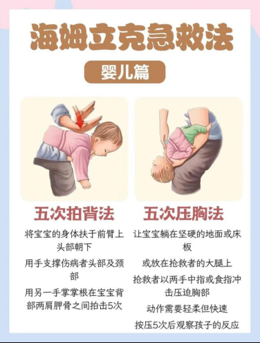 施救流程:5次背部拍击→5次胸部冲击,循环操作,其余处置与成人/儿童一致。